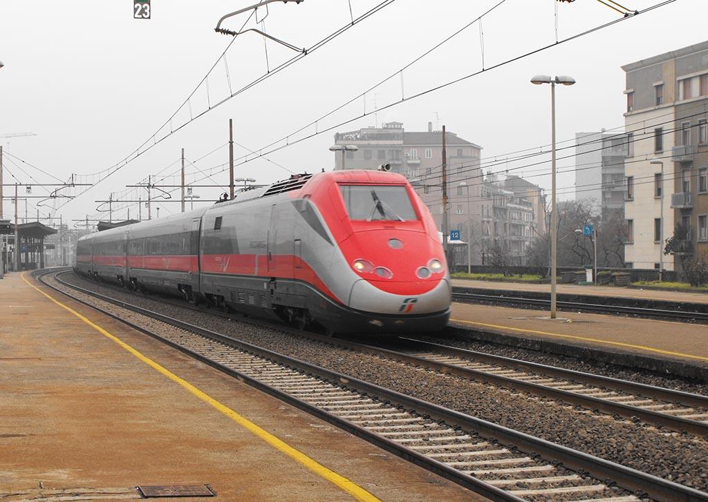 A train ETR 500 AV Frecciarossa (Red arrow) of Trenitalia from Roma goes through station of Milano Lambrate over the tracks of the by-pass to the line to Torino, its final destination; in Milano it stops in Garibaldi station; 20.01.2010 Photo: Fulvio Quattroccolo |
