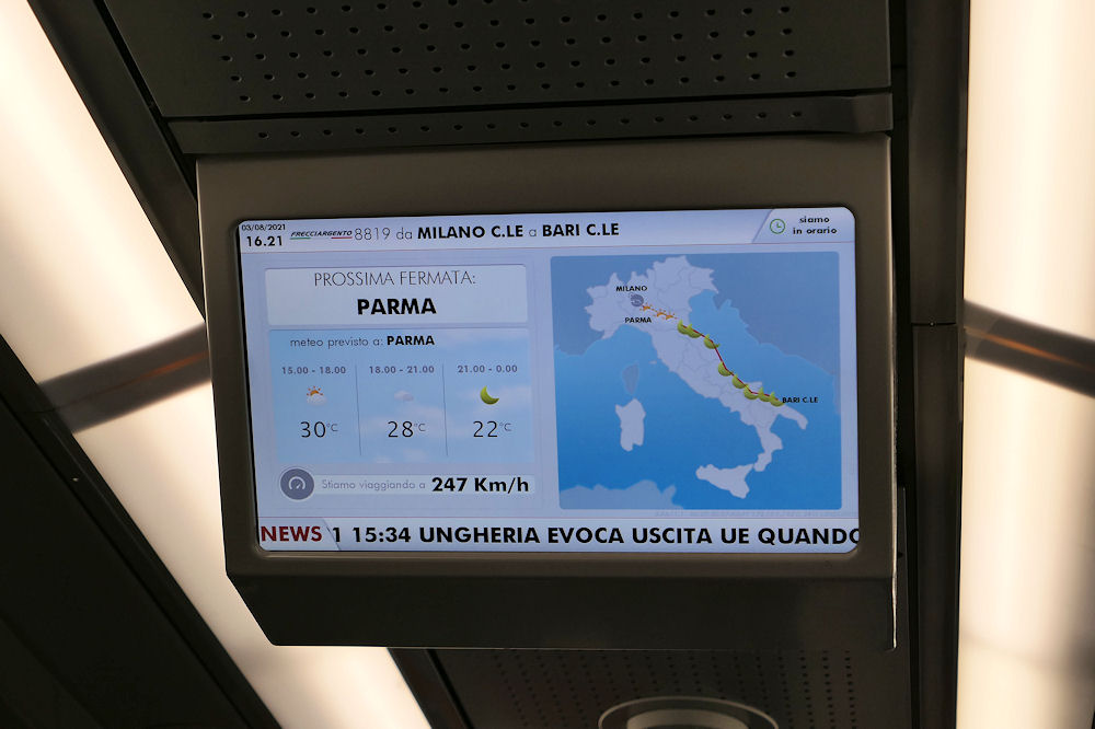 Trenitalia - Italy Information screen in an ETR.700 trainset (former Dutch "Fyra"). A very long run - Milano to Bari - but currently running at almost 250km/h. Parma, 03-08-2021 Digital photo by Marco van Uden |