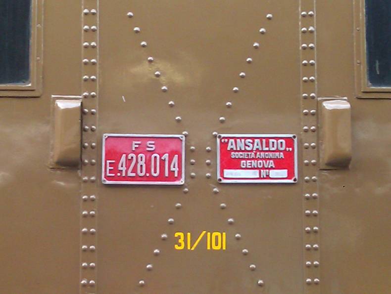 Targhe della locomotiva elettrica E.428.014 FS, in sosta a Roma Termini il 21/5/2011.
