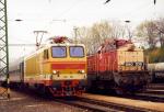 FS E492 004 electric locomotive for 25 kV 50 Hz with fast train #902 (Budapest Déli-Szombathely) on a MAV test run near M40 209 diesel locomotive at Ajka station, Hungary, on 21.04.2001.