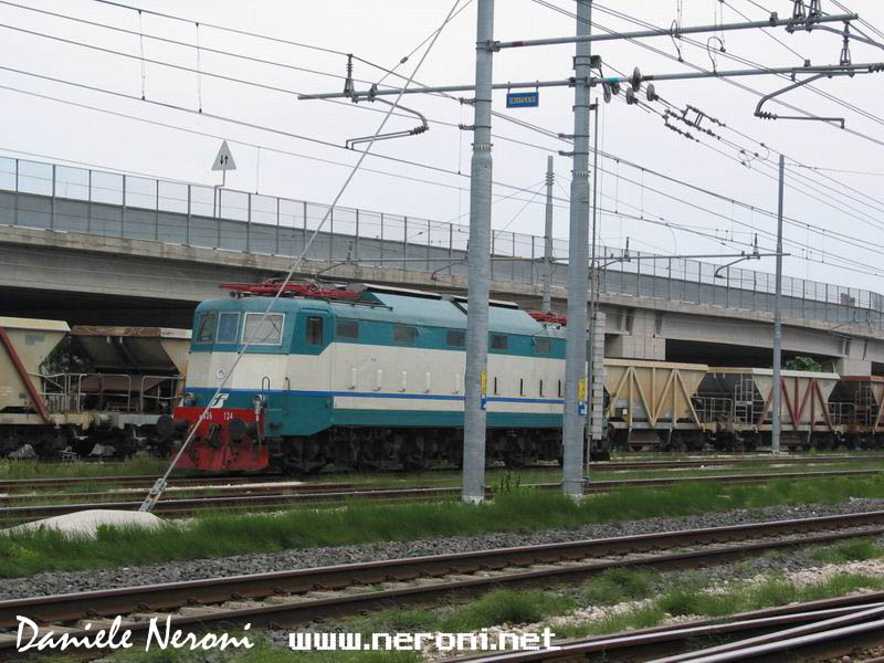 FS electric loco class E636-124 at chiavari hauling some flats 31.7.04