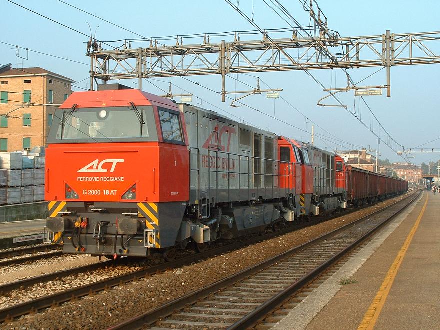 La locomotiva diesel G2000.17 delle ACT (Ferrovie Reggiane) in testa ad un treno merci in sosta nella stazione di Reggio Emilia sulla linea FS Milano - Bologna.