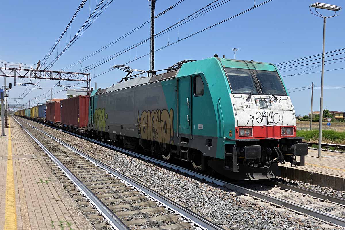 leased to Medway Italia, this heavily graffitted Alpha Trains eletric loco E 483 014 (NVR 91 83 2483 014-3 I-OCG) runnng southbound with a container train at San Giorgio di Piano BO station. 22/05/2024.