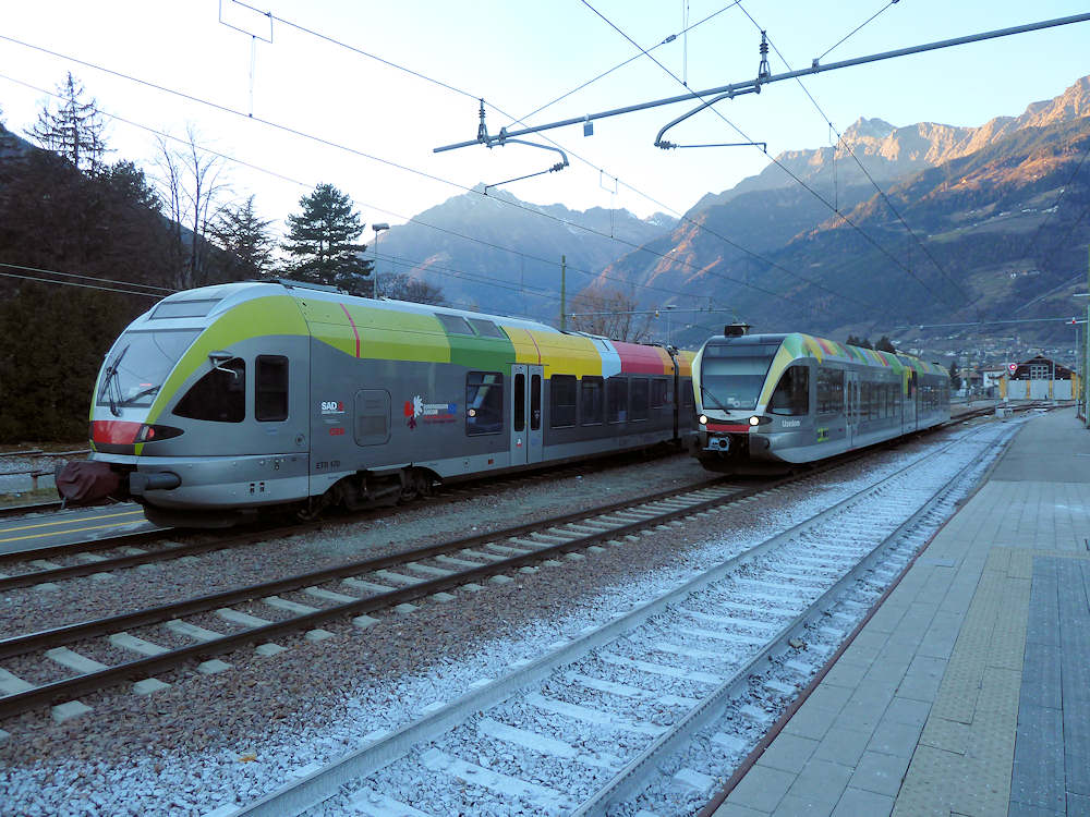 SAD - Italy The regional trains that run in the Südtirol province of Italy are owned by the province and mostly operated by SAD (some by Trenitalia). After arrival of ATR 100-004 it poses together with 002 in Mals. Mals, 30-12-2015 Digital photo by Marco van Uden |