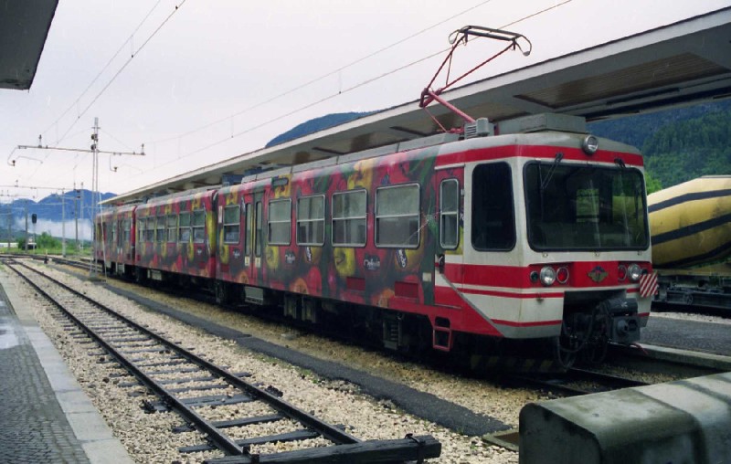 Ferrovia Elettrica Trento-Male 3 car EMU #ET18 was operating train #13 arriving at Mezzocorona Borgata Station on Sunday September 5th, 2001. It originated at Cles at 10:14, departing here at 10:46 for the FTM station in Trento.