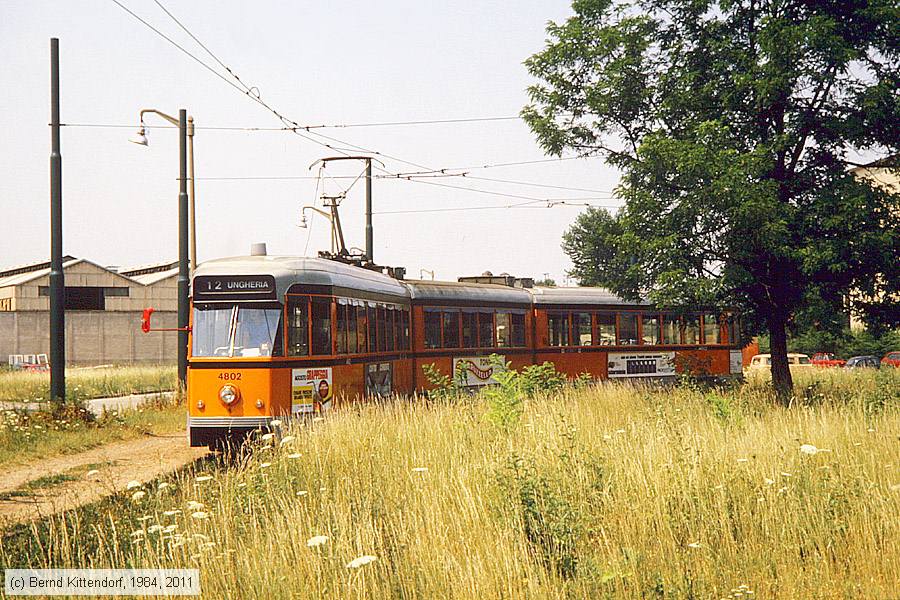 Tram Milano - 4802 Straßenbahntriebwagen 4802 auf Linie 12, aufgenommen am 30. Juli 1984.