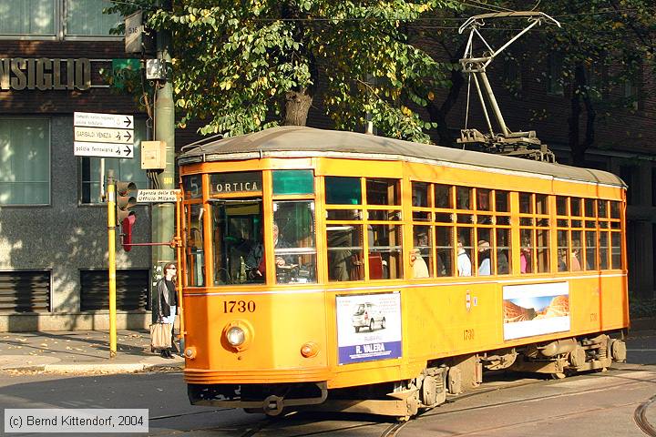 Tram Milano - ATM 1730 Triebwagen 1730 als Linie 23 in der Via Viotti. Die Aufnahme erfolgte vom Bahnsteig des Bahnhofs Milano Lambrate F.S. aus am 06. November 2004.