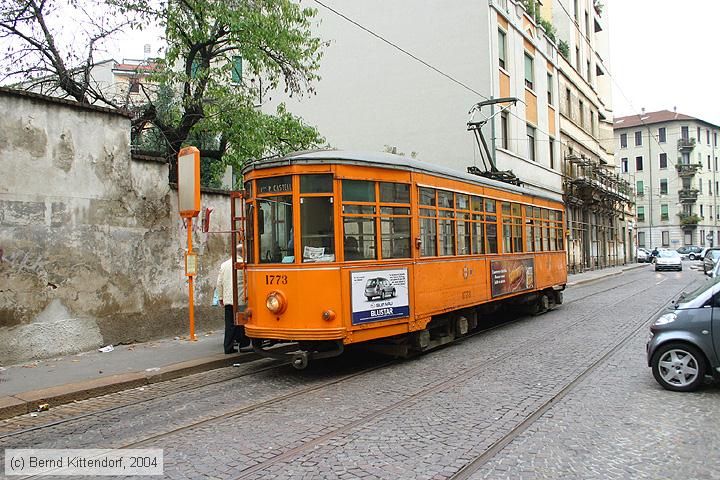 Tram Milano - ATM 1773 Triebwagen 1773 der Straßenbahn Mailand beim Bahnhof Milano Centrale F.S.. Der Triebwagen hat die Achsfolge Bo'Bo' und ist etwa 13,89 Meter lang. (05. November 2004)