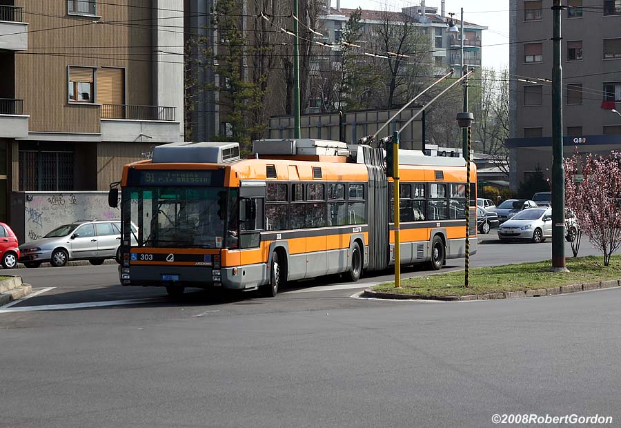 Milan ATM trolleybus #303, a line 91 pull-in at Novara Depot, March 14, 2008. Photo by Robert Gordon (wcparrg0@aol.com) |