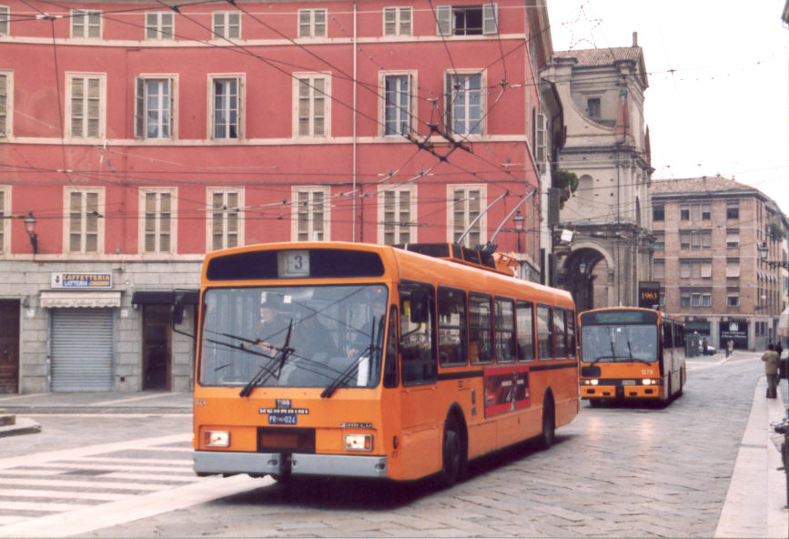 Parma 15 novembre 2003, Filobus Menarini Monocar 201/1LF TEP n° 024 ripreso in centro città. da notare che tale vettura è ancora nella versione originale del 1982. Photo and scan by Luca Kaiblinger (lk702@hotmail.com) |