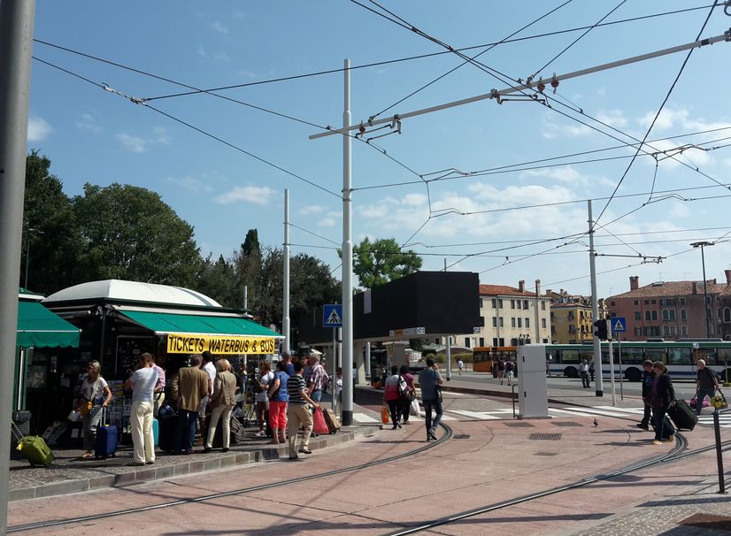| Station for Translohr guided trolleybus, not yet operational. Venezia Piazzale Roma, 2015-09-02. (In background you can see regular diesel buses connecting to the mainland.) |