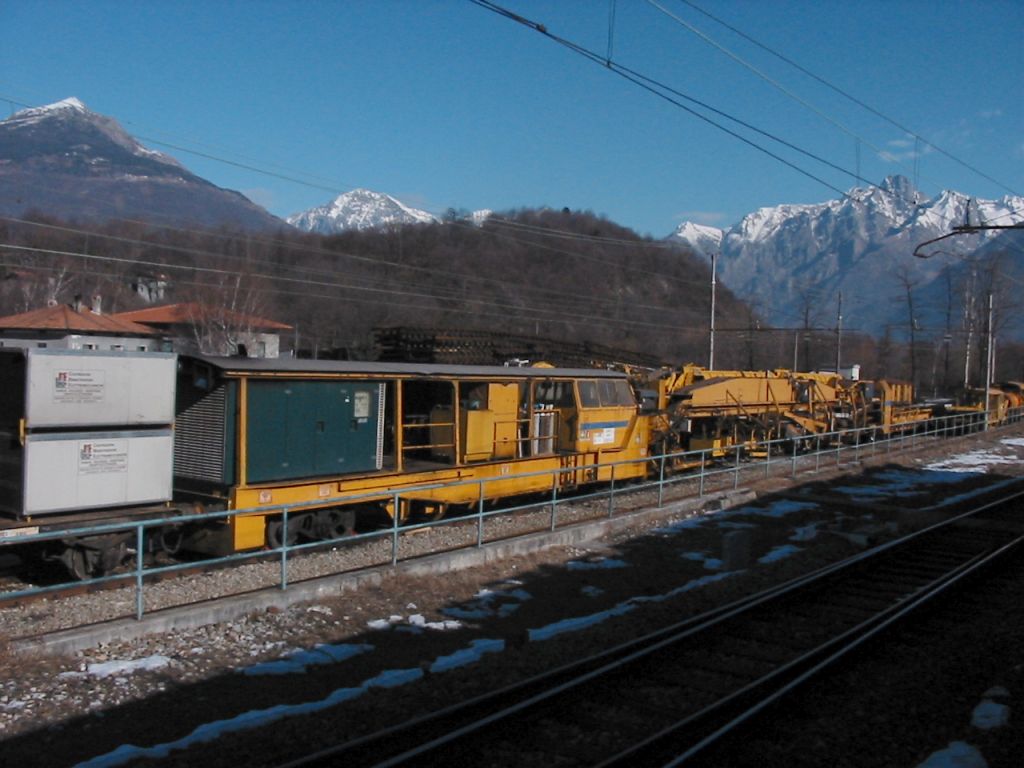 Una rincalzatrice delle FS ripresa alla stazione di Catanzaro Lido, in composizione ad un treno cantiere.