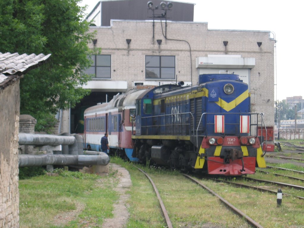LG - Lithuania Diesel shunter TEM2-996 shunts a motor car of a class D1 trainset into the trainset maintenance hall. Vilnius, 18-07-2005 Digital photo by Marco van Uden |