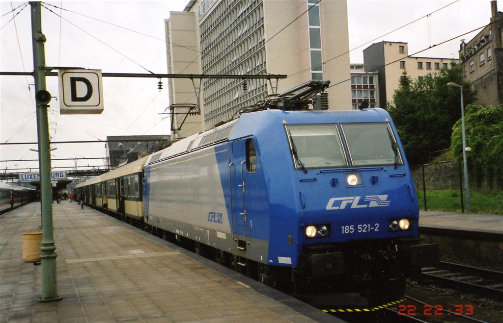 | CFL 185-521-2. Luxembourg station. RE-train for Troisvierges 26-07-2004. Photo; Arthur Akkermans. art_nl12@hotmail.com |