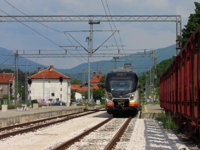 Ismét Montenegróban: a ŽCG új CAF motorvonata Podgoricába érkezik Nikšičből Again in Montenegro: the new CAF-mad EMU of ŽCG is seen arriving in Podgorica on the railway from Nikšič |