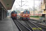 Two China diesel DF4B-2602 passager locomotive and SS1-0707 cargo locomotive in Guangzhou Station