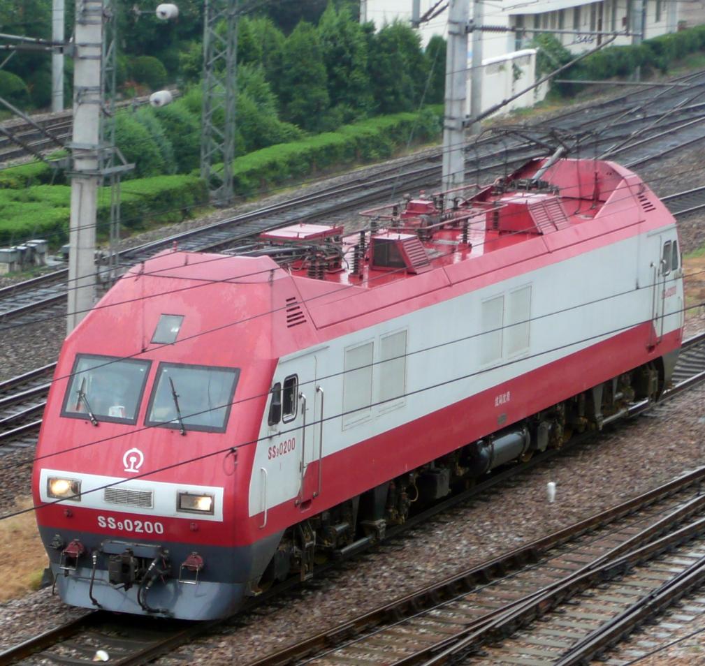| Electric passenger locomotive SS9 0200 (Co'Co' 170 km/h) at Shanghai central station. Locomotives of this type have been built by Zhuzhou since 1998. 2009-07-22. |