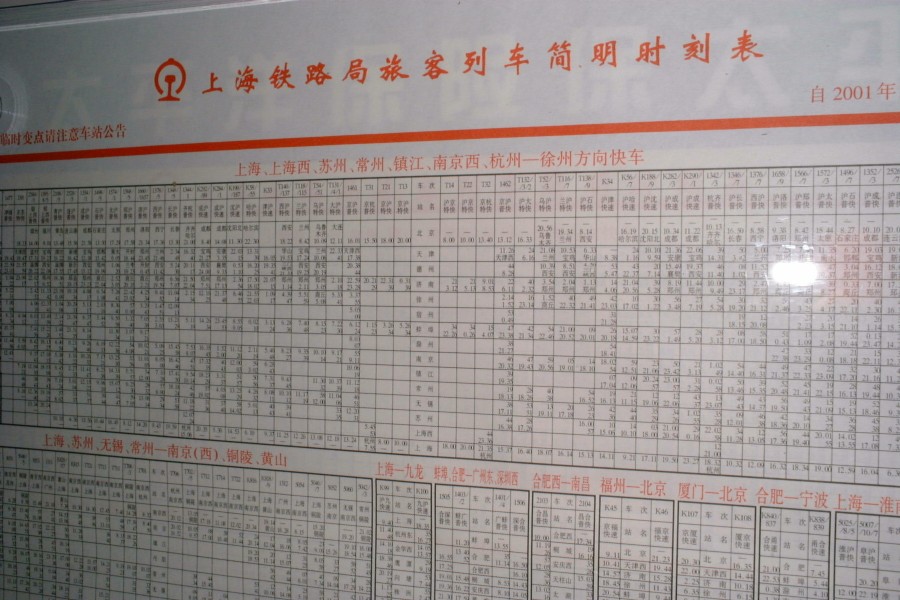 9. auf 10. September 2001, zwischen Peking und Schanghai Fahrplanaushang im Nachtzug, Abfahrt 20 Uhr.