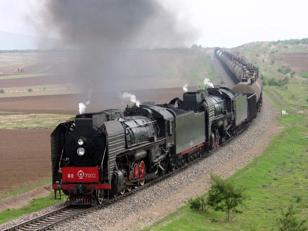 QJs 7002 and 7048 with a freight train leaving Lindong on the 6th June 2005.