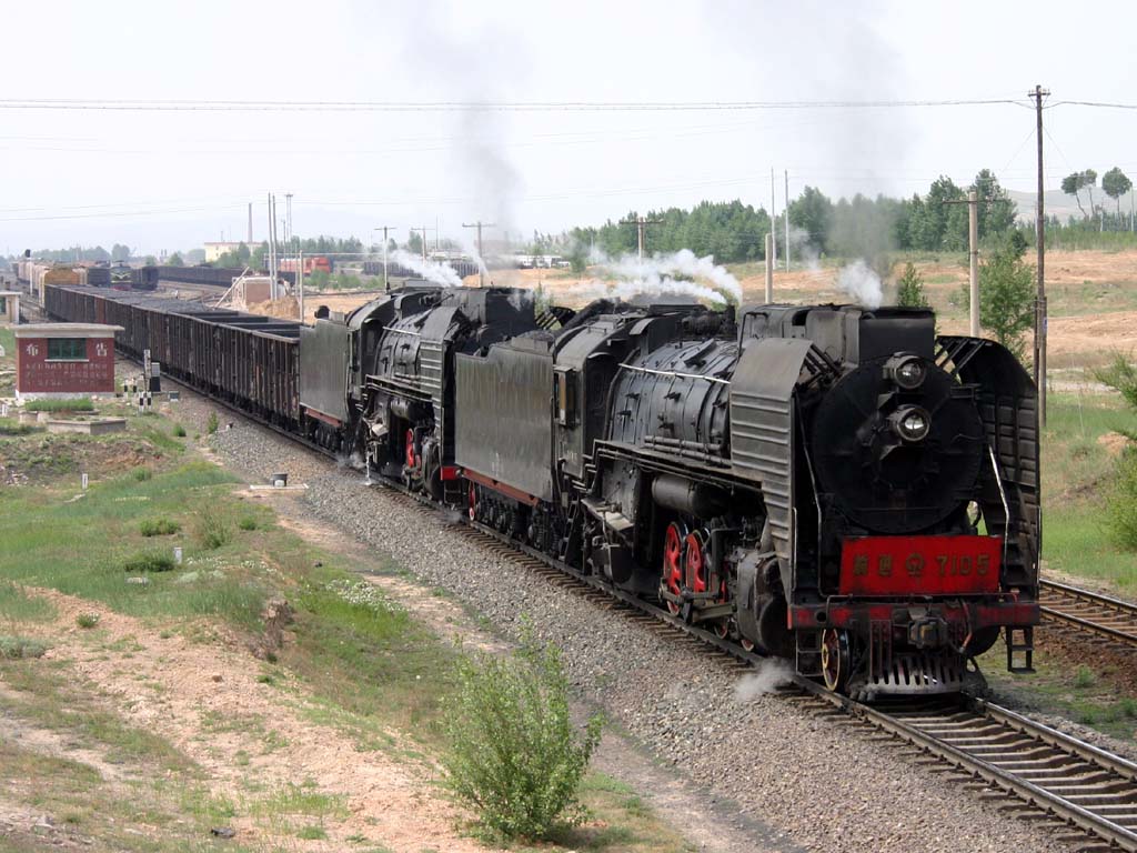 QJs 7105 and 7143 are leaving Daban with a freight on the 5th June 2005.