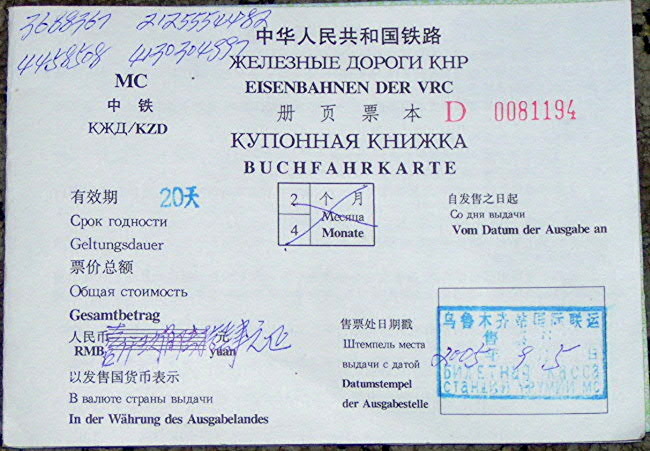Sleeping car reservation Urumchi - Alma-Ata (for four persons), issued by Chinese Railways. Price shown in Swiss Franks.