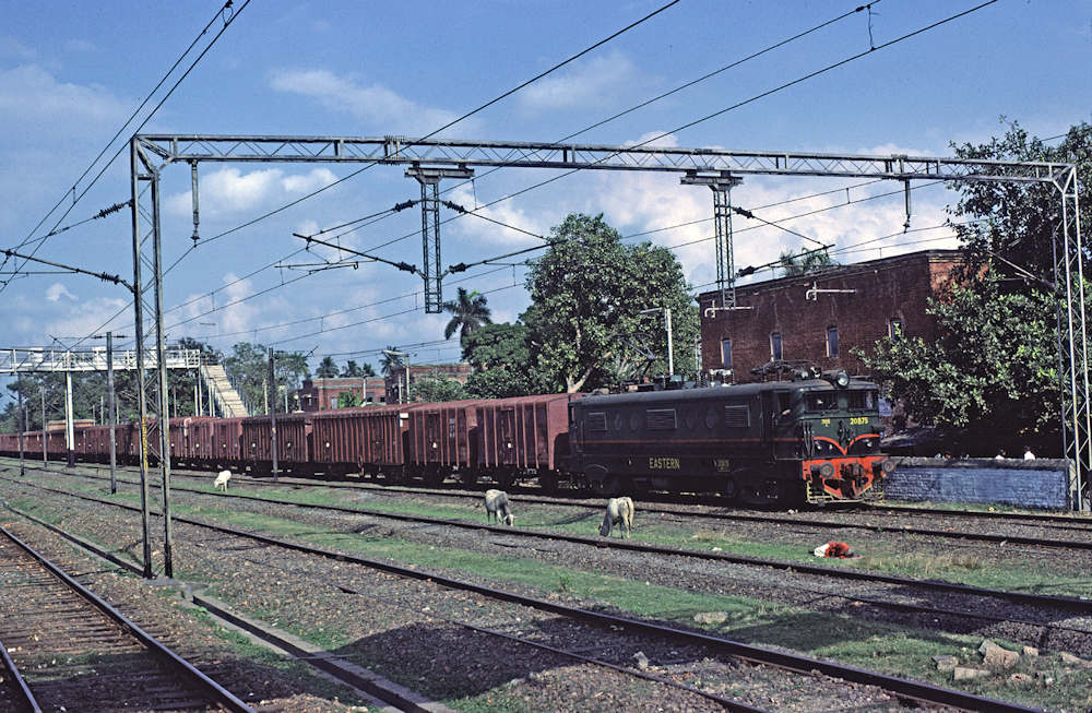 | Eastern Region Naihati station B-B 25kv AC BG electric locomotive WAG-1 20875 (Chittaranjan 1965) trundles through with a long train of four- and eight-wheeled vans. The literally "sacred cows" of India unconcernedly munch on! All 112 Class WAG-1 have been withdrawn; one is displayed in the Indian Railways' musuem at Delhi. 2.12.1979. Roger Griffiths roger.griffiths@hotmail.com |