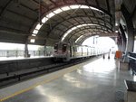| Six-car Bombardier train leaving station Qutb Minar on the yellow line of Metro Delhi towards the south. This line was opened 2004, when the delivery of this type of train also started; the first were imported from Germany (some flown in with an Antonov cargo plane), the rest built in the Bombardier works of India. Unfortunately photography is forbidden in the stations and trains, in some stations they are very strict about that, I still managed to get this Photo. 2012-12-07. |