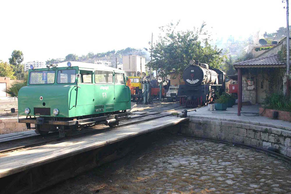 | Jordan 20.9.2008: A view across Amman shed’s turntable, upon which sits Wickham “trolley” No. 301 and beyond that a Land Rover, converted for rail use. Beside the Land Rover can be seen the depot’s lifting jacks; all maintenance for the remaining steam locomotives is carried out at this small shed, a tribute to the skill of the men working there. Pacific No. 85 carries builder’s plate Nippon/1959, but in fact the loco and four sisters were built in 1953, as a subsequently cancelled order for Thai Railways, being provided to Jordan Railways in 1959. Other steam locomotives present at Amman were Nippon-built Pacific No. 82, seemingly in working order; 2-8-2 No. 72 (HSP 2145/1956) not in use and another RSH 2-8-2, also out of use, but it was not possible to determine if it was No. 21 or 22. Lastly, 2-6-2T No. 62 (HSP 2148/1956) is mounted on a plinth, surrounded by bushes and not in good condition. Roger Griffiths; roger.griffiths@hotmail.com |