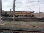 ONCF E-1114 passes Sidi El Aïdi junction with a empty phosphate train for Khouribga mines. This locomotives built by Hitachi in 1977 are used today for freight trains only. All of the 22 built engines are still in service. The original Japanese pantographs have been replaced by one arm units of French design. They are equipped with rheostatic breaking.