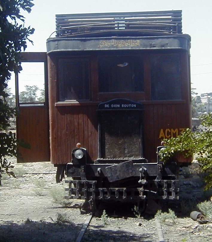 | Syria 27.9.2008: The chaotic conditions inside the carriage workshop at Cadem did show evidence of active restoration underway on several wooden-bodied coaches, so although no-one would commit as to why such work was being done, might it just be a small ray of hope for the future….? Of great interest at extreme right is the 4-wheel De Dion trailer formerly attached to the now unique De Dion-Bouton petrol railcar No.ACM3, seen earlier, out of use at Dera’a. Roger Griffiths; roger.griffiths@hotmail.com |