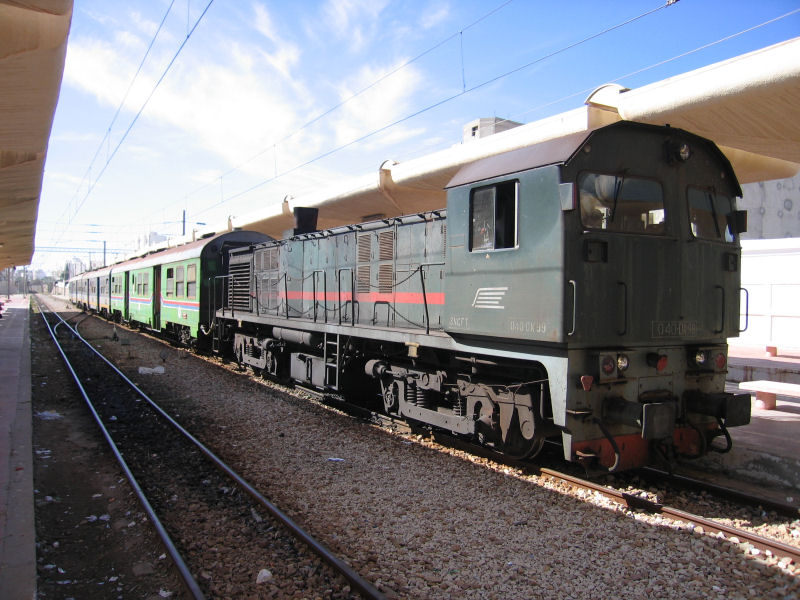 SNCFT - Tunisia 20 locomotives of class 040-DK were built by MLW (Canada) from 1976. They are used for light passenger trains, like on Tunis-Bizerte (standard gauge, 2 locomotives) and Tunis-Borj Cédria. But they also help out on the "Métro léger du Sahel" Sousse-Monastir-Mahdia. Note the very new 25kV catenary! Mahdia, 23-10-2006 Digital photo by Marco van Uden |