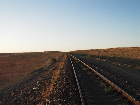 The Ashgabat-Dashoguz railway line in the desert, Darwaza, Ahal province, Türkmenistan. 24.08.2013.