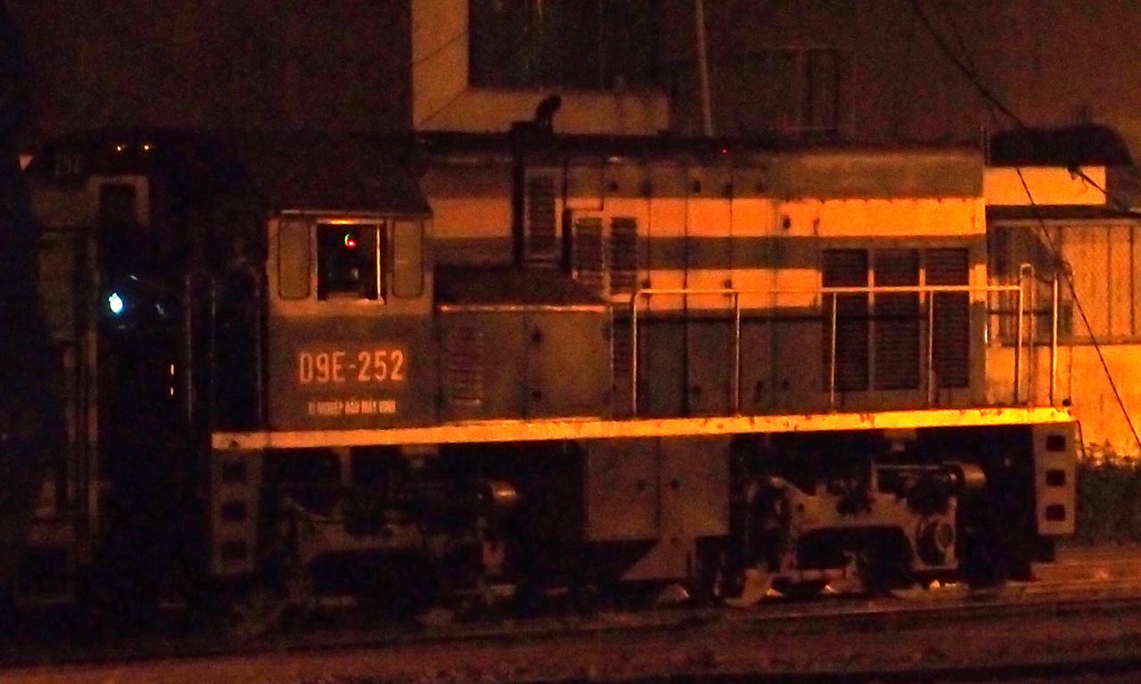 | Vietnam Railways diesel locomotive D9E-252. This is a General Electric type U8B built from 1963 and delivered to South Vietnam in 48 units originally numbered BB907 to BB954. After reunification 1975 renumbered to D9E-207 to 254. Nowadays they also operate into the north, the photo was taken at midnight in Dong Hoi, in very dim light. The locomotive was coupled to the D13E-725 with a freight train. 2014-05-11. |