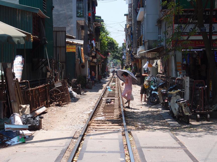| Track north of Ha Noi (Vietnam) station, 2014-05-13. The mainline to both sides of the country's most important station looks like this ... and when there is no train, the track is often used for other purposes. |