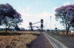 Gwelo_shed_coaling_plant. Steam in Southern Africa: Rhodesia 1973. Approached between two magnificent Jacaranda trees, Gwelo sheds coaling plant was a remarkably complex affair! Coal was delivered in wagons, emptied by a grab crane into a hopper, to travel up two conveyors, to the top of the tower. From there it spiralled down into locomotive tenders, as required, passing through a sieve device which separated lumps that were too small, they being diverted via a chute, back into the coal wagons. In other words, from delivery to locomotive, the coal went through a complete mechanical circle! roger.griffiths@hotmail.com |