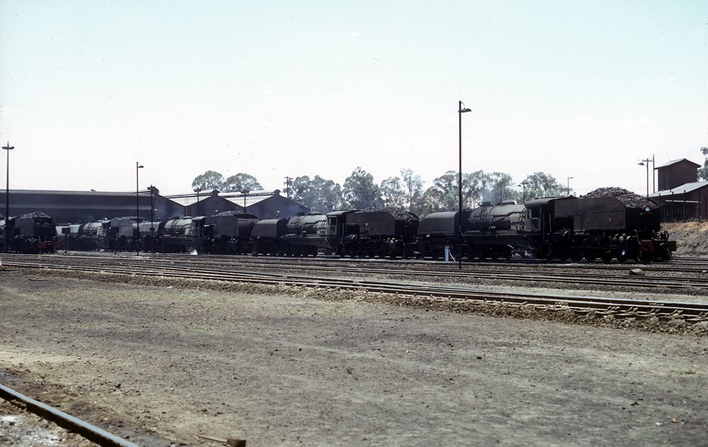 Bulawayo_shed_West_end_panorama. Steam in Southern Africa: Rhodesia 1973. The west end of Bulawayo engine shed is where locomotives just returned from traffic, or awaiting attention, were parked. Six Beyer Garratts are visible with behind, the twin gabled roof over the depots repair shop. 26th October 1973. roger.griffiths@hotmail.com |