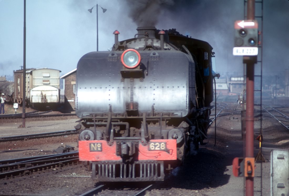 Bulawayo_station_16A_628. Steam in Southern Africa: Rhodesia 1973. Having brought in a freight train on 27th October 1973, Class 16A 2-8-2+2-8-2 Beyer Garratt No.628 (BP 7506/1952), spectacularly rushes through Bulawayo station on its way to the engine shed. roger.griffiths@hotmail.com |