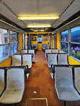 An interior in a private narrow gauge EMU ETR 004 at railway station Pompei Scavi, using a passenger train from Sorento to Napoli Porta Nolana.