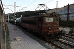 A private electric locomotive with number 91 52 00 87 017 - 7, owned by private operator BRC ("Bulgarian Railway Company") at railway station Iliyantsi, after pulling a freight train.