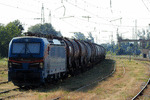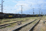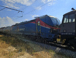 A private electric locomotive with number 91 52 00 85 608 - 5, owned by private operator "Rail Net Cargo" at railway station Pazardjik with freight train.