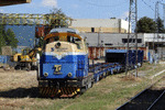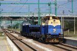 A private diesel locomotive with number 92 52 00 07 264 - 1, owned by private operator "Euro Engineering" cross through railway station Pazardjik with work train. A video about crossing, you can see here: