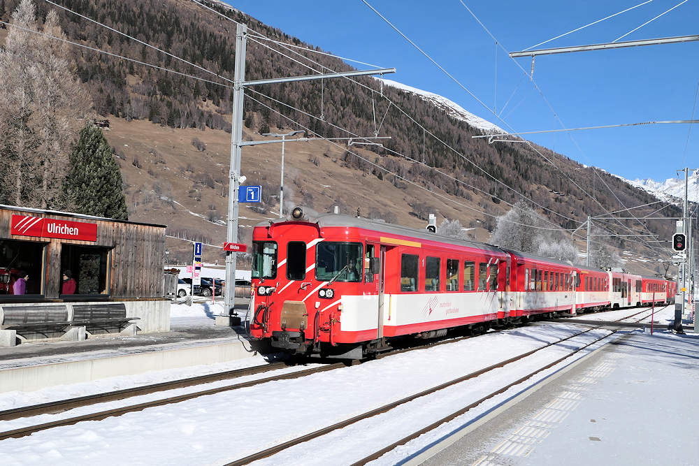 MGB - Switzerland One of the old trains with driving trailer ABt nr. 4152 leading arrives at the station of Ulrichen, on its way from Andermatt to Visp. From 2026 these old trains will be replaced by new "Orion" trainsets. Ulrichen, 01-01-2026 Photo by Marco van Uden |