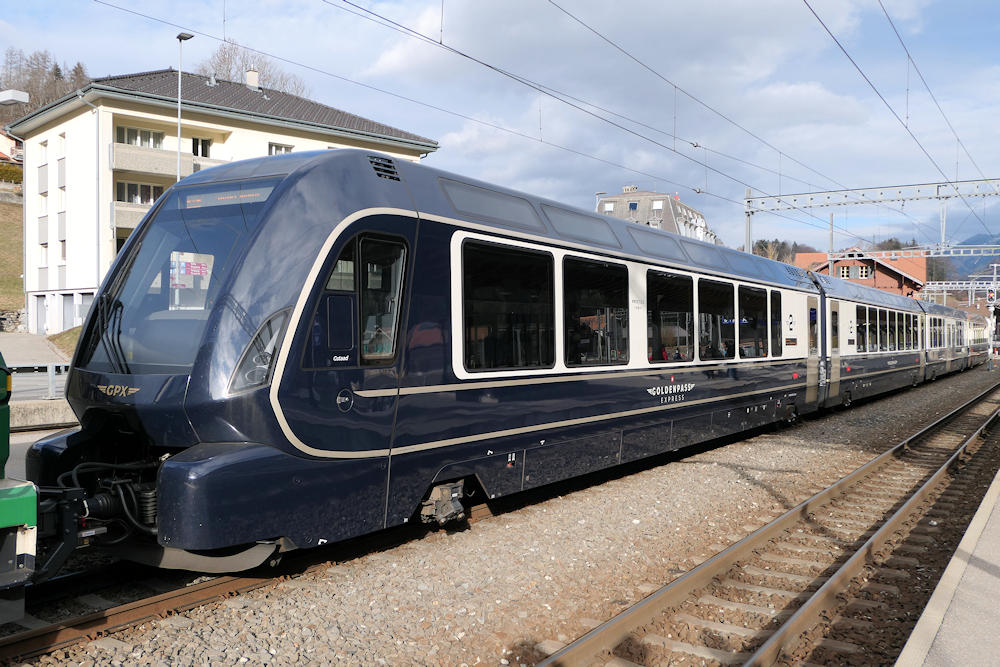 MOB - Switzerland A GoldenPass Express variable gauge coach set, originating from Montreux and on its way to Interlaken. In Zweisimmen it will change gauge from the MOB meter gauge to the BLS standard gauge. Montbovon, 02-01-2026 Photo by Marco van Uden |