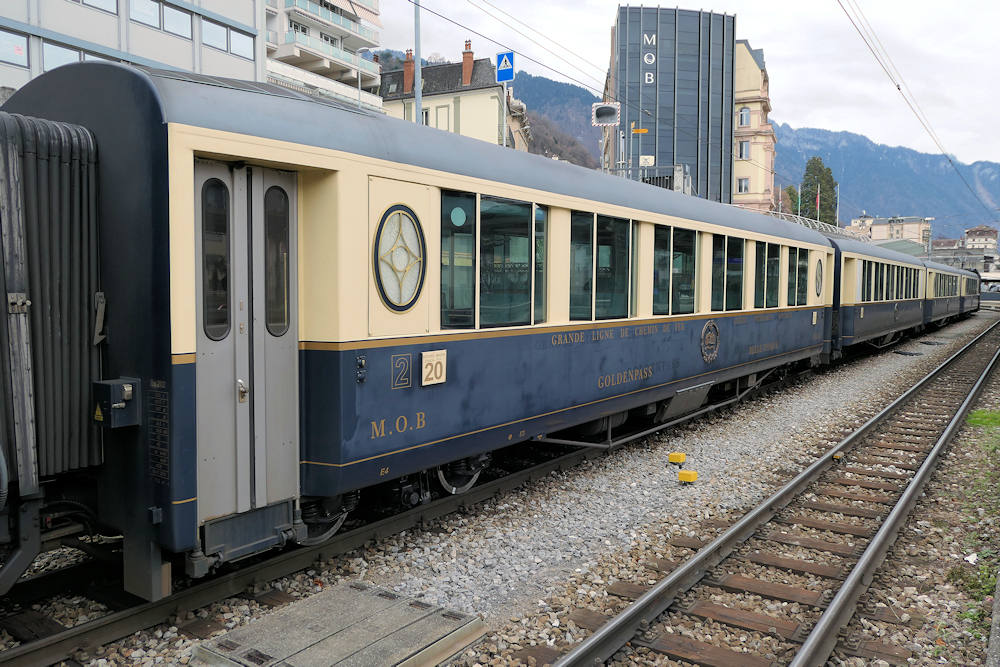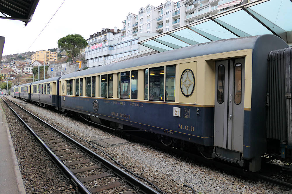 MOB - Switzerland Set of coaches for the Belle Epoque train. Today these four coaches were hauled/pushed by modern motor cars ABe 4/4 9303 and Be 4/4 9203. Montreux, 02-01-2026 Photo by Marco van Uden |