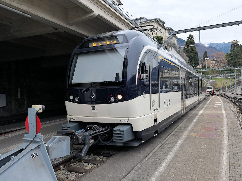 MVR - Switzerland Some of the MVR rack-and-adhesion trainsets class ABeh 2/6 are used for local trains from Montreux. Trainset 7508 is stabled waiting for another duty. Montreux, 02-01-2026 Photo by Marco van Uden |