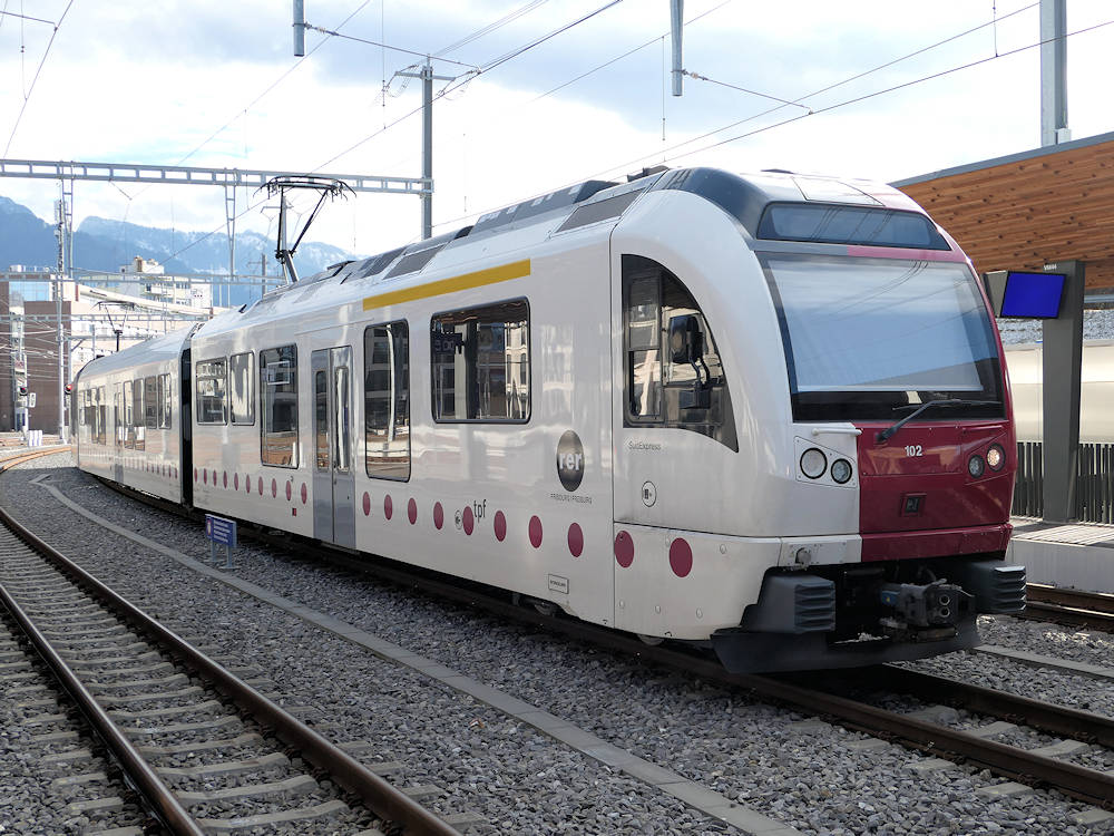 TPF - Switzerland Narrow gauge trainset ABe 4/12 number 102 (with a second class center car) is seen stabled at Bulle. This type of trainsets built by Stadler is now very common on Western Swiss narrow gauge lines. Bulle, 02-01-2026 Photo by Marco van Uden |