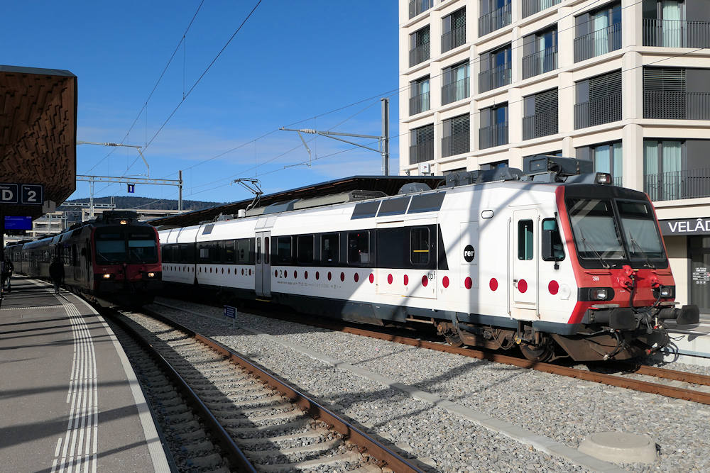 TPF - Switzerland For operation on standard gauge lines, TPF took over 14 "Domino" trainsets from SBB. Motor car RBDe 560 269 is seen stabled in Bulle. Another trainset to the left is about to depart towards Broc Chocolaterie. Bulle, 02-01-2026 Photo by Marco van Uden |