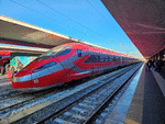 A high speed EMU ETR 1000 of FS (Ferrovie dello Stato / Italian Railways) at railway station Napoli Centrale, using a train "Freccia Rossa" with number AV 2520 to Milano Centrale.