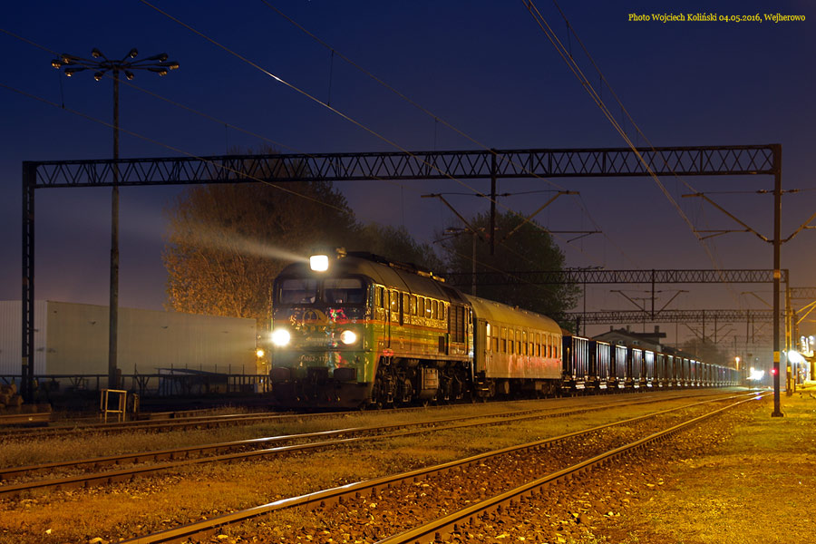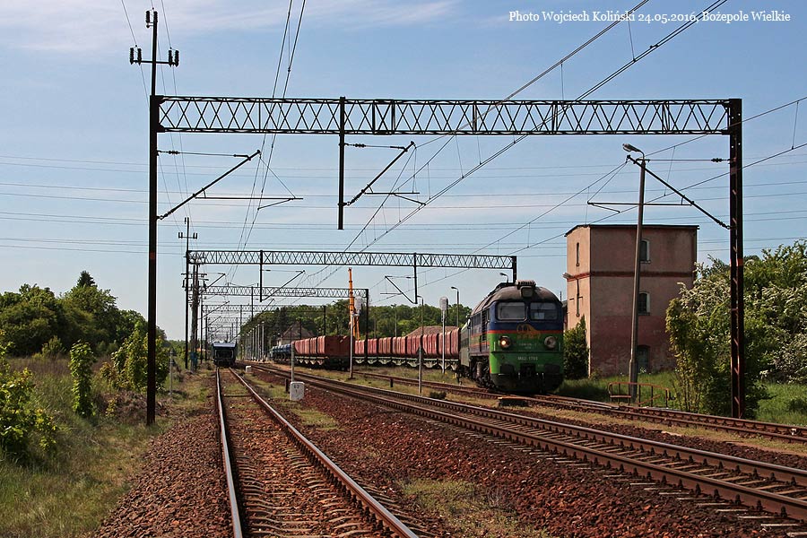 Pomorskie Przedsiebiorstwo Mechaniczno-Torowe (PPMT) M62-1705 pushes the train with crushed stone near the Lazek stop 04.05.2021, Tlen Photo W. Kolins |
