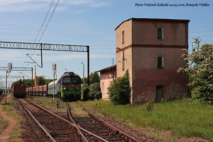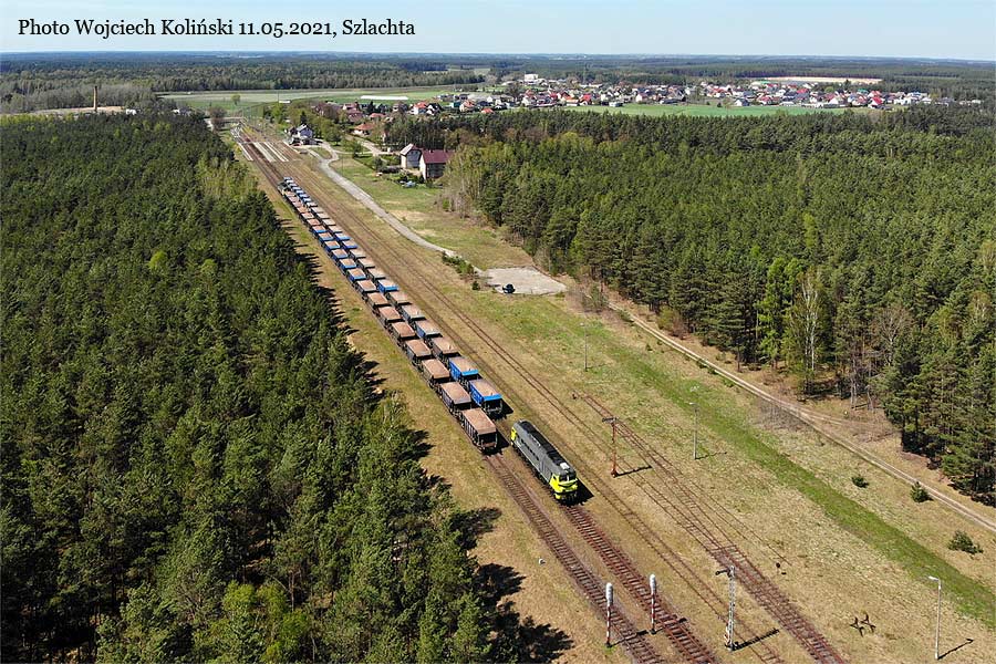 Pomorskie Przedsiebiorstwo Mechaniczno-Torowe (PPMT) M62-1705 pushes the train with crushed stone near the Sliwiczki stop 11.05.2021, Szlachta Photo W. Kolins |